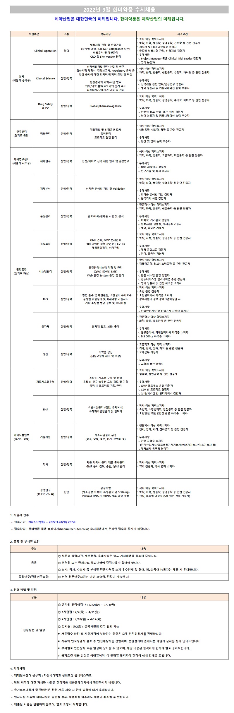 2022년 3월 수시채용 (임상/R&D/품질/생산 등)