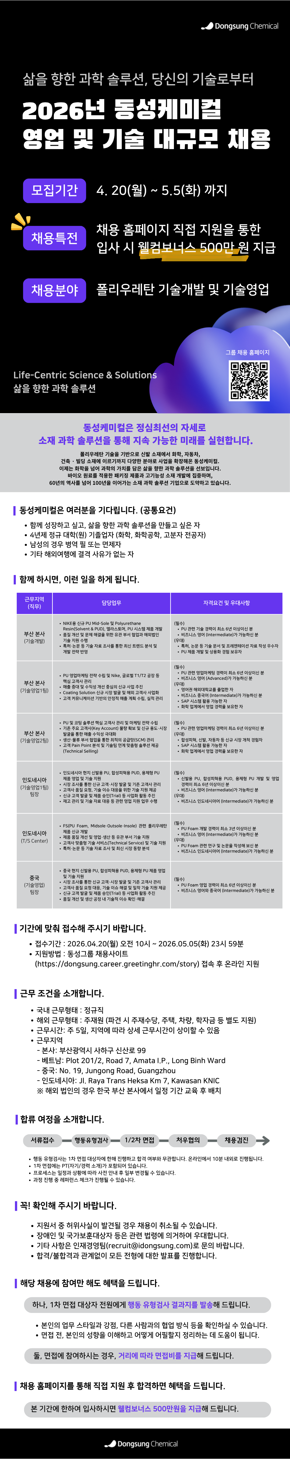 구인정보 [동성케미컬] 2026년 폴리우레탄 대규모 경력사원 채용 0 동성케미컬 기업구분 기업 사원수 1600 명 설립일 1959년 9월 주요사업 부산, 해외 홈페이지 https://idongsung.com/ 주소 서울 중구 통일로2길 1611(순화동, AIA Tower(에이아이에이타워))(04511) 기업·기관 소개 (주)동성케미컬은 Chemistry 기술로 우리 생활에 필요한 소재를 만듭니다. 계열사 동성화인텍 · 제네웰 · 디엔케이켐텍의 경영 투명성과 효율성을 제고합니다. 케미컬 · 모빌리티 · 빌딩 · 건축 · 에너지 · 헬스케어 각 분야의 시너지를 창출하고 Energy Saving, Environment Friendly 기술로 지속가능한 성장을 이뤄나가고 있습니다. 동성케미컬에서 함께 성장해나갈 분들의 많은 지원 부탁드립니다! 채용정보 모집부문 고무 제품성형 주요업무 기술영업, 기술개발 근무시간 근무형태 정규직 경력 경력 5 년 이상 연령 제한없음 학력 대학교(4년)이상↑ 모집인원 0 명 급여 면접 후 결정 성별 무관 근무지역 부산, 해외 복리후생 건강보험 , 고용보험 , 국민연금 , 주5일근무 , 연차/월차 , 자녀학자금 , 퇴직금 , 의료/건강지원 상세요강 접수기간 및 방법 접수기간 2026년 4월 20일 ~ 2026년 5월 5일 담당자 김지은 전화 -- Email junekim@idongsung.com 접수방법 CHEM-BIO 접수 / 홈페이지접수 목록 입사지원