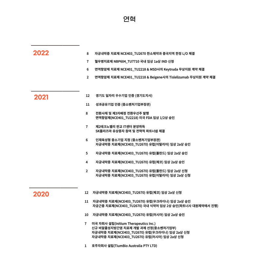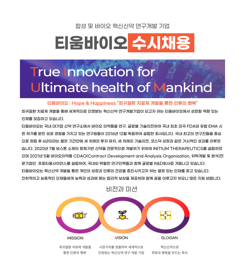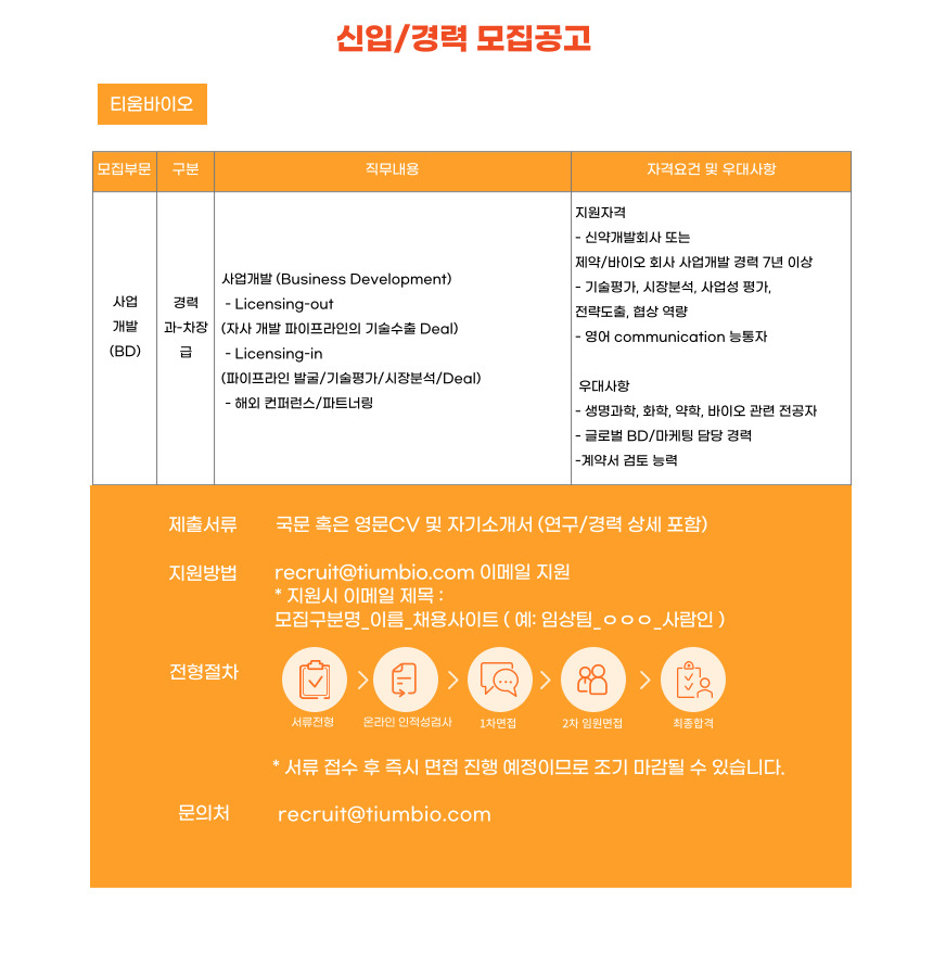 구인정보 [티움바이오] 사업개발팀 (과-차장급) 0 티움바이오 기업구분 기업 사원수 53 명 설립일 2016년 12월 주요사업 경기 > 성남시 수정구 홈페이지 주소 경기 성남시 수정구 창업로 40번길 306층 티움바이오(시흥동, 판교IT센터)(13449) 기업·기관 소개 채용정보 모집부문 경영전략·사업기획·마케팅 주요업무 사업개발 근무시간 근무형태 정규직 경력 경력 5 년 이상 연령 제한없음 학력 대학교(4년)이상↑ 모집인원 0 명 급여 협의 성별 무관 근무지역 경기 > 성남시 수정구 복리후생 고용보험 , 국민연금 , 산재보험 , 주5일근무 , 연차/월차 , 퇴직금 , 의료/건강지원 상세요강 접수기간 및 방법 접수기간 2023년 11월 16일 ~ 2023년 12월 16일 담당자 티움바이오 전화 -- Email recruit@tiumbio.com 접수방법 CHEM-BIO 접수 / 이메일접수 목록 입사지원